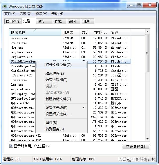 在后台进程里面,找到Flash Helper Service,选择结束进程。再重复第三步就完成操作了。注意这里是在后台进程里面。