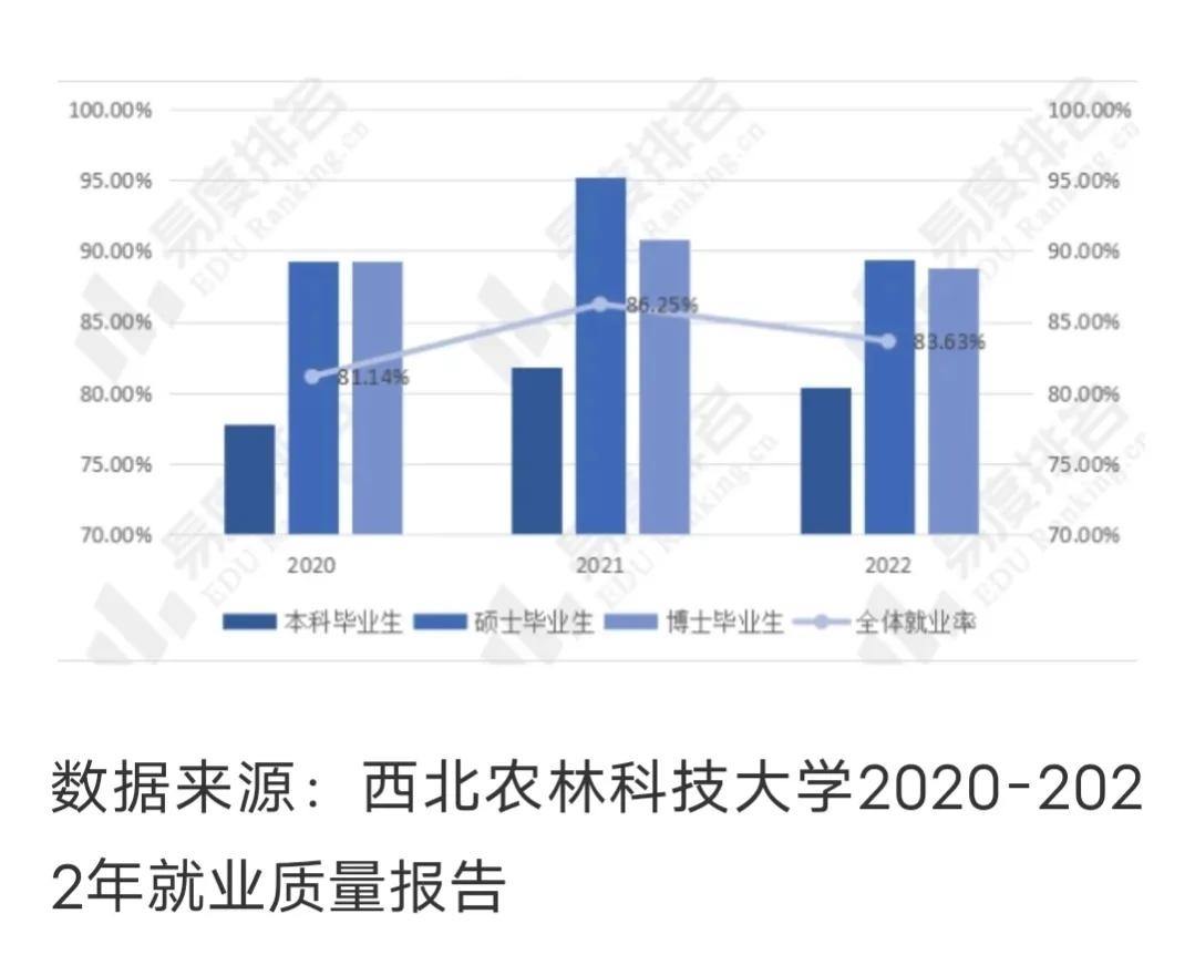 第三,咱们看看就业和升学。西北农林科技大学近三年多就业率2020年本科就业率77.75%,总体就业率81.14%.2021年总体85.25%.2022年本科就业率80.35%总体就业率83.63%.大家看看图表:2020~2022年西北农林科技大学总体就业率: