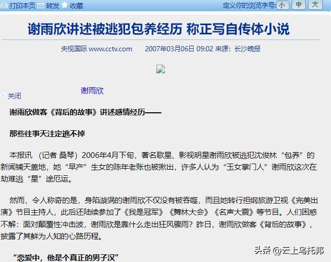 信息来源:长沙晚报 2007年03月06日谢雨欣讲述被逃犯包养经历 称正写自传体小说