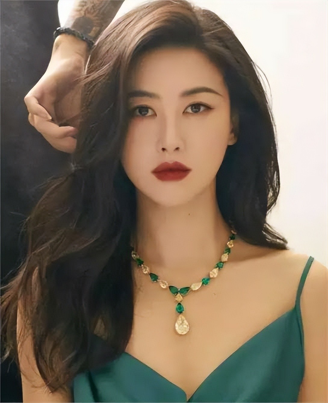 穿上深V黑裙,绿宝石的点缀更是将她的傲人身材展现得淋漓尽致。