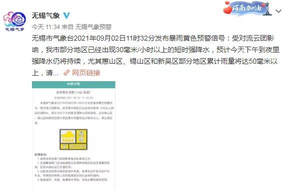 9月2日上午,@无锡气象 连发两次预警,10点左右发布雷暴大风黄色预警信号;11点32分发布暴雨黄色预警信号。