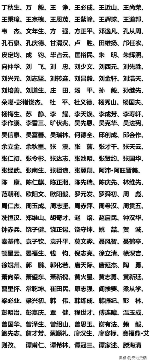 建国后,很多排名按照姓氏笔画。丁姓笔画最少,丁秋生中将排名第一。接下来是万毅、王诤、王必成、王近山,依次按照姓氏笔画排名。