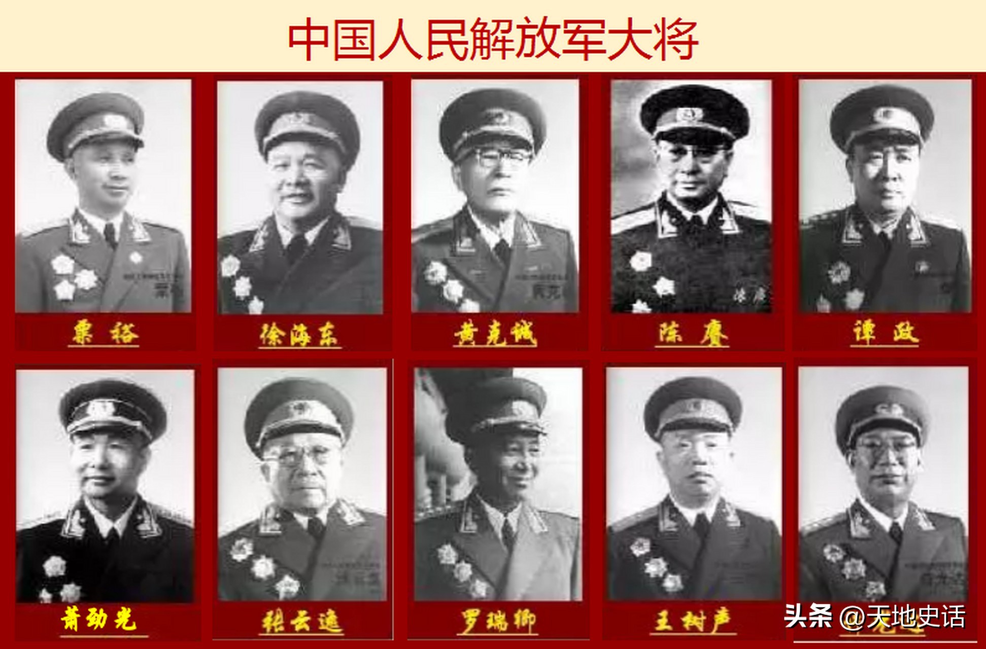 10大将军也有明确排序:粟裕解放战争军功最大,排在第一;长征后,徐海东给中央红军雪中送炭,排名第二;后面依次是黄克诚、陈赓、谭政、萧劲光、张云逸、罗瑞卿、王树声、许光达。