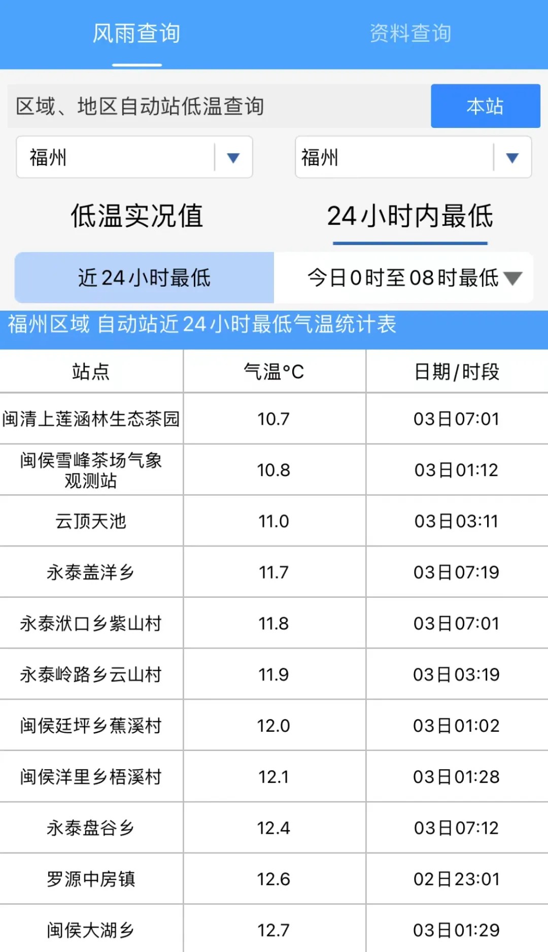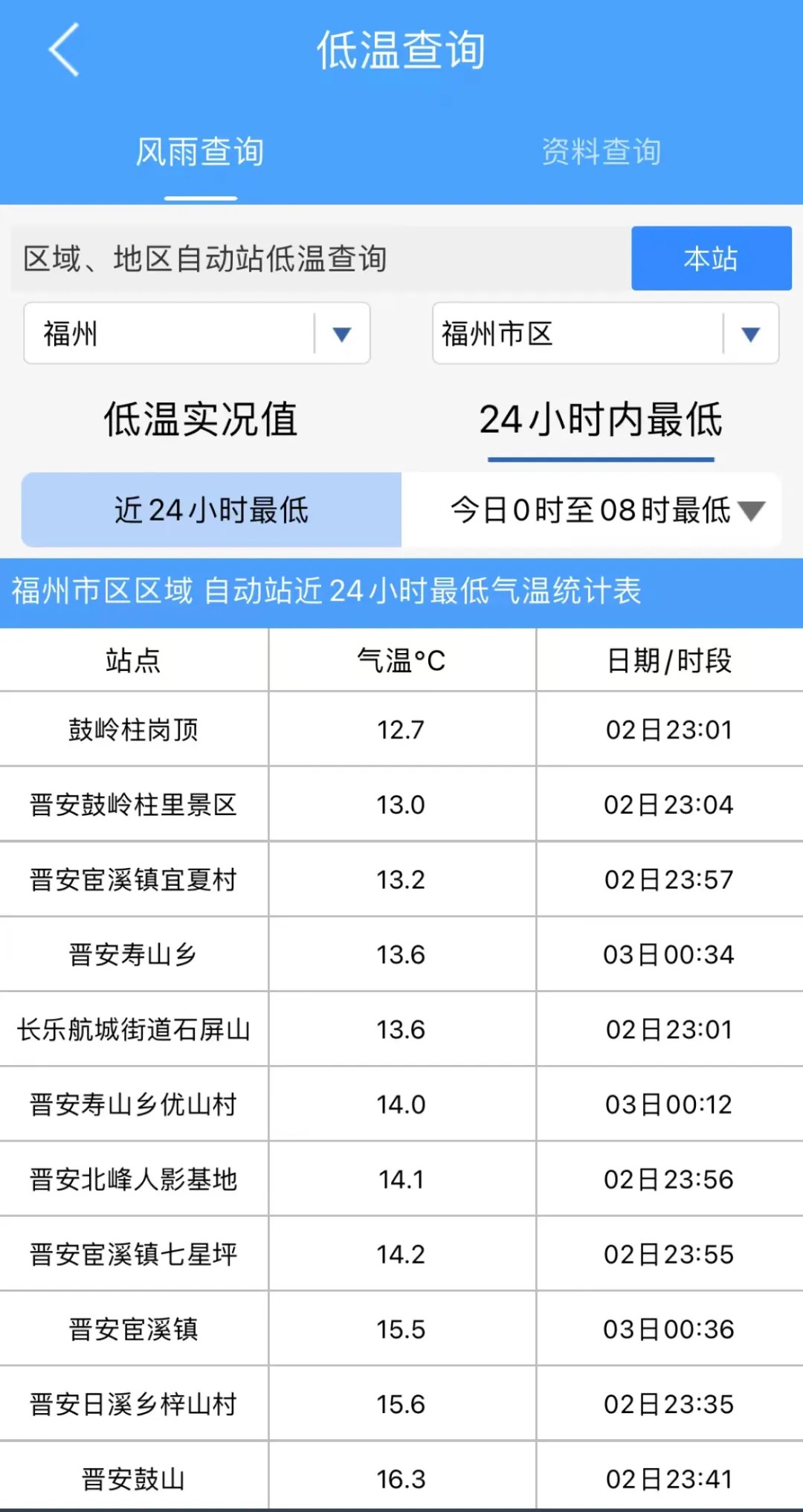 知天气App显示,昨夜今晨福州多个区域、地区自动站最低气温均在15℃以下。