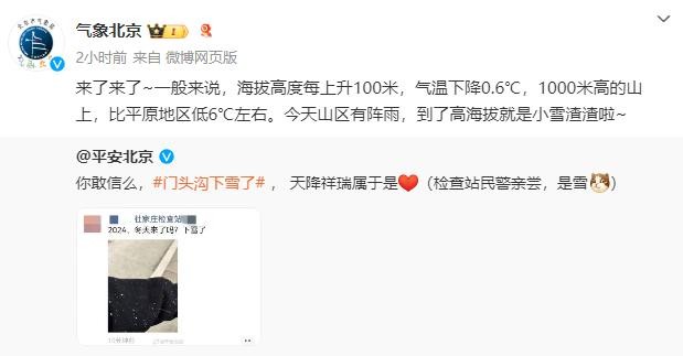 @平安北京 发布微博:你敢信么?北京门头沟下雪了,天降祥瑞属于是(检查站民警亲尝,是雪)