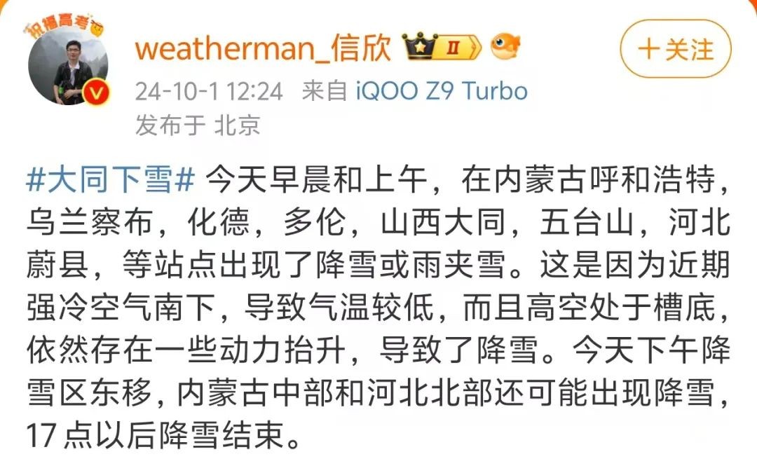 据中国气象频道首席气象分析师信欣,10月1日早晨和上午在内蒙古呼和浩特、乌兰察布、化德、多伦,山西大同、五台山,河北张家口蔚县等站点出现了降雪或雨夹雪。