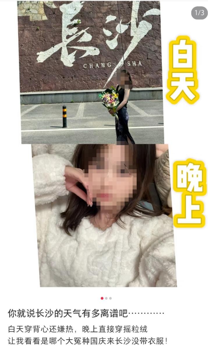 已经在长沙的网友表示,长沙忽冷忽热的,“奉劝国庆要来的姐妹们,看看天气预报再准备衣服”,因为“带错衣服真的很尴尬”!