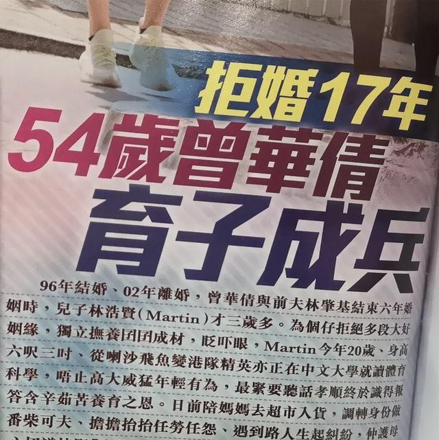 如今单身一人的曾华倩,独自抚养孩子已经长达17年之久。2002年,曾华倩和前夫林肇基离婚,结束了6年的婚姻。当年儿子Martin才三岁多,曾华倩为了儿子这么多年都未嫁,独自抚养儿子成人。从照片中来看,儿子已经比妈妈高出了一个头,两人有说有笑并肩而行,看上去十分孝顺。