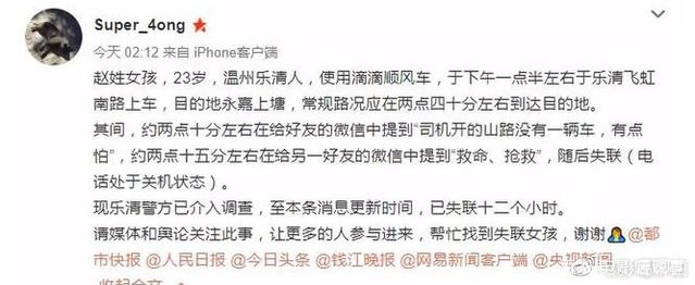25日早晨,浙江一网友在微博上发出求救微博,称温州乐清女孩小赵24日中午乘坐滴滴顺风车失联,失联前,小赵曾在微信上给朋友发出“司机开的山路没有一辆车,有点怕”、“救命、抢救”等求救信息。