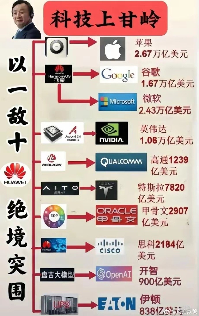 也就是华为的市值相当于英伟达,加苹果,加高通,加谷歌等。