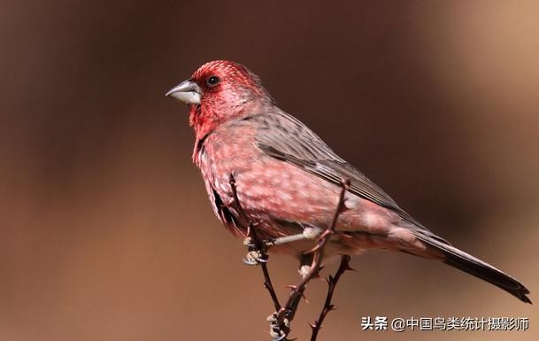大朱雀(学名:Carpodacus rubicilla):体重33-52克;体长167-205毫米;雄性成鸟:头部、颏至上胸光亮洋红色,除眼先和眼周外均具白色光泽斑点,颊及耳羽亮粉红色;颈、背和短的尾上覆羽、小和中覆羽等呈带粉红的黄褐灰色,微具羽干纹;腰粉红色;尾羽及长的尾上覆羽褐至黑褐色,外侧一对尾羽具宽阔的白色外缘,其余尾羽羽缘与背同色;大覆羽淡褐色,亦具与背同色的羽缘;小翼羽、初级覆羽和飞羽暗褐色,次级飞羽较淡并具宽阔的较苍白的粉红色羽缘;初级飞羽羽缘淡粉红色,第一枚的羽缘近白色;下体余部粉红色;翼下覆羽和腋羽淡灰而沾红。 雌性成鸟:上体从头至短的尾上覆羽,包括肩羽和小、中覆羽黄褐色,具暗色纵纹;长的尾上覆羽和尾羽褐色,外侧一对尾羽具窄的白边,其他尾羽具淡褐色狭边;飞羽黑褐色,具淡灰色羽缘;下体淡灰沾黄,具少量窄的褐色羽干纹。虹膜暗褐色;嘴黄褐色;脚黑褐色。