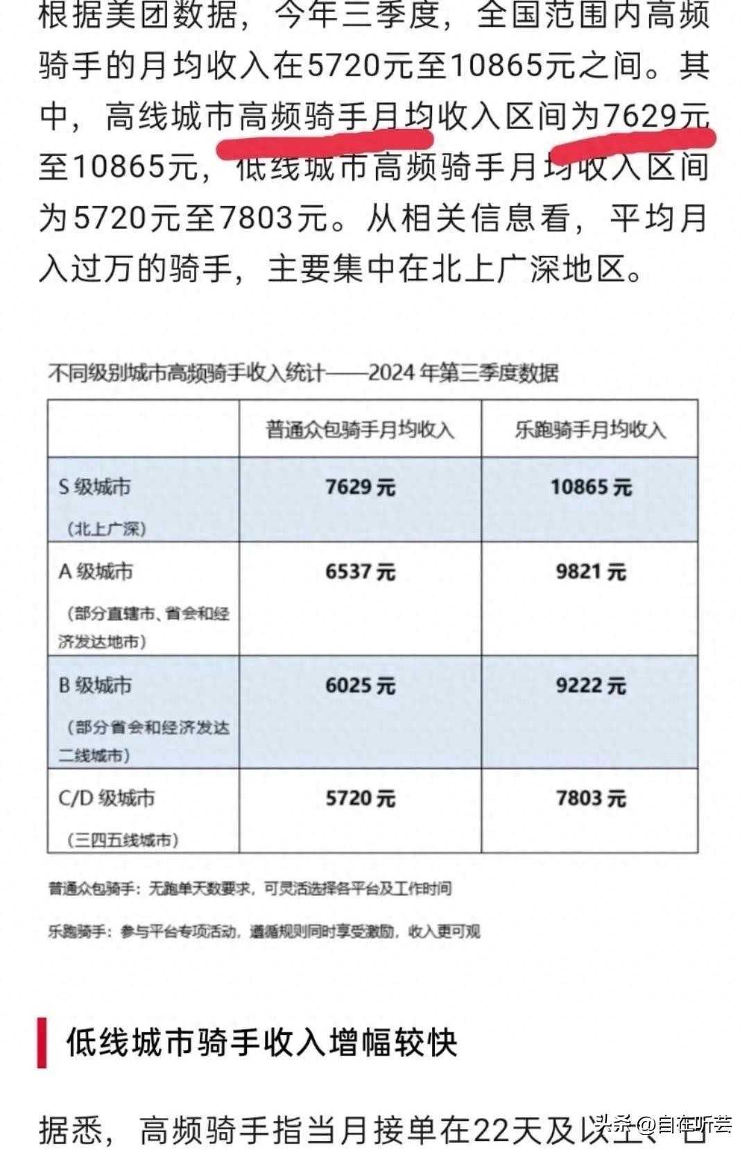 关于骑手的真实收入,美团在财报电话会上提供了更详细的数据。全国范围内的高频骑手,即当月接单天数在22天及以上、日均接单时长在6小时以上的骑手,月收入在5720元至10865元之间。高线城市的高频骑手月均收入区间为7629元至10865元,而低线城市的高频骑手月均收入区间则为5720元至7803元。收入差异主要源于跑单类型的不同,乐跑等参与平台专项活动的骑手,由于有各类激励和相应规则,获取的收入也更为可观。据统计,高频骑手的平均收入略高于当地居民平均收入。