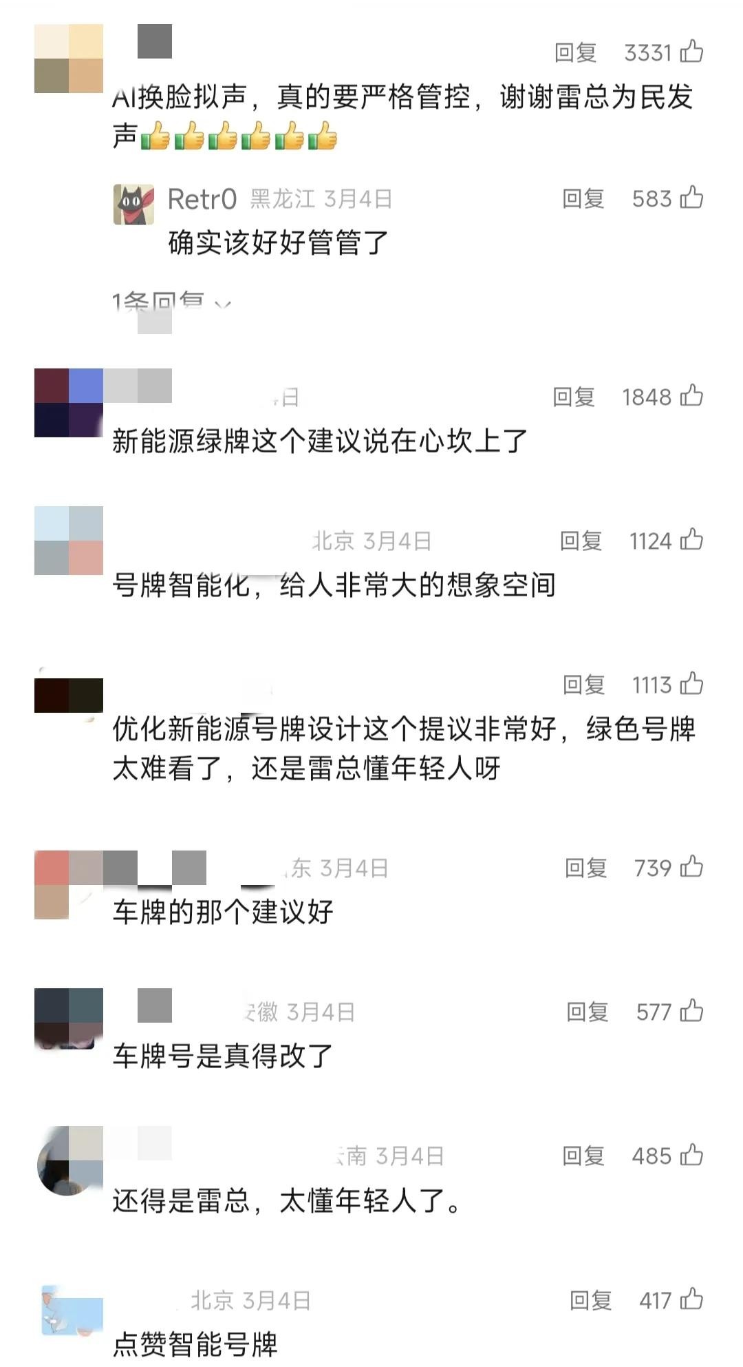 所以雷军提出的第四个话题是关于优化新能源汽车号牌设计的建议随着年轻消费者数量增多,用户对汽车外观与个性化功能拥有更加多元化的需求。例如,新能源汽车的绿色号牌在某种程度上制约了汽车产品的设计效果,现有汽车号牌不具备智能化能力,难以满足日常出行、交通管理的智能化发展需求。优化号牌颜色设计、拓展号牌智能化功能对于推进汽车消费、增加经济活力有一定的促进作用。