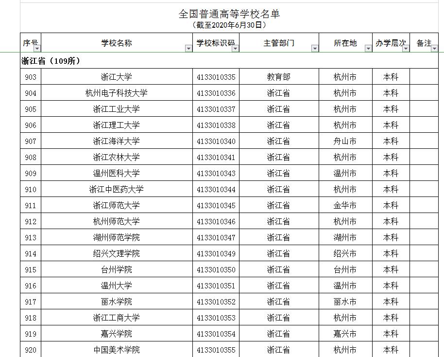 至2025年6月30日,教育部公布的2740所全国普通高等学校中,浙江省有109所: