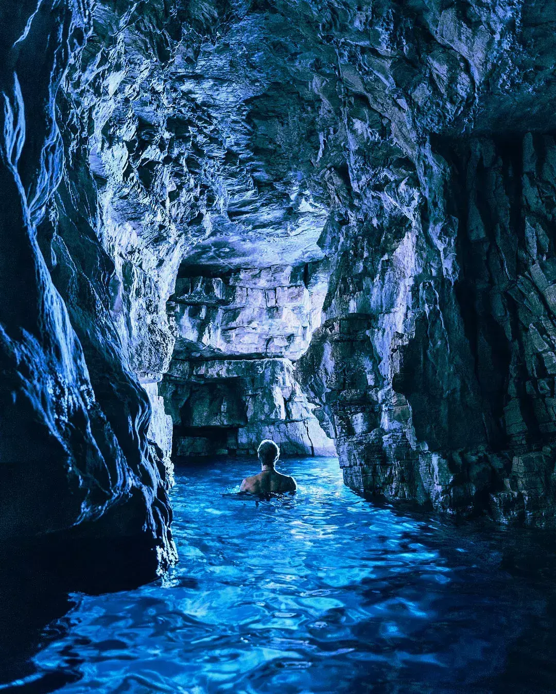 最有名的比舍沃岛蓝洞在亚得里亚海中心,在夏季的上午 11 点到中午 12 点间,阳光恰好可以照进洞穴内部,经过水面的反射,整个洞穴都沐浴在海蓝色宝石般的氛围中。
