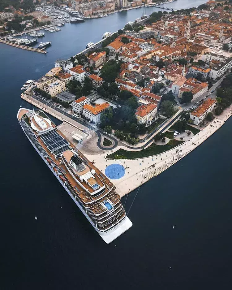 这个海岸广场从空中俯瞰有一个小蓝点,克罗地亚人喜欢到傍晚的海边躺着休息,吹一吹海风,听一会海风琴的演奏,静静地等待海上的日落。