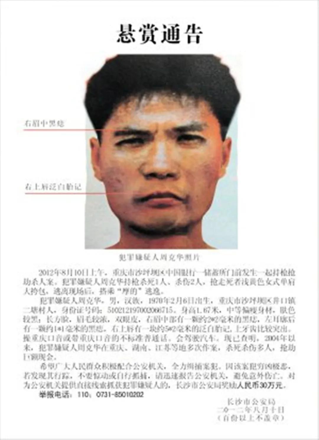 在公告中还有这么一句:“现已查明,2004年以来,周克华在江苏、湖南、重庆等地多次作案,杀死杀伤多人,抢劫巨额现金。”