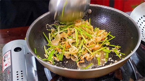 锅中炒香后,再下入海蜇和香菜一起翻炒,这个时候我们需要大火快速翻炒,不然海蜇比较容易出水,吃起来影响口感。