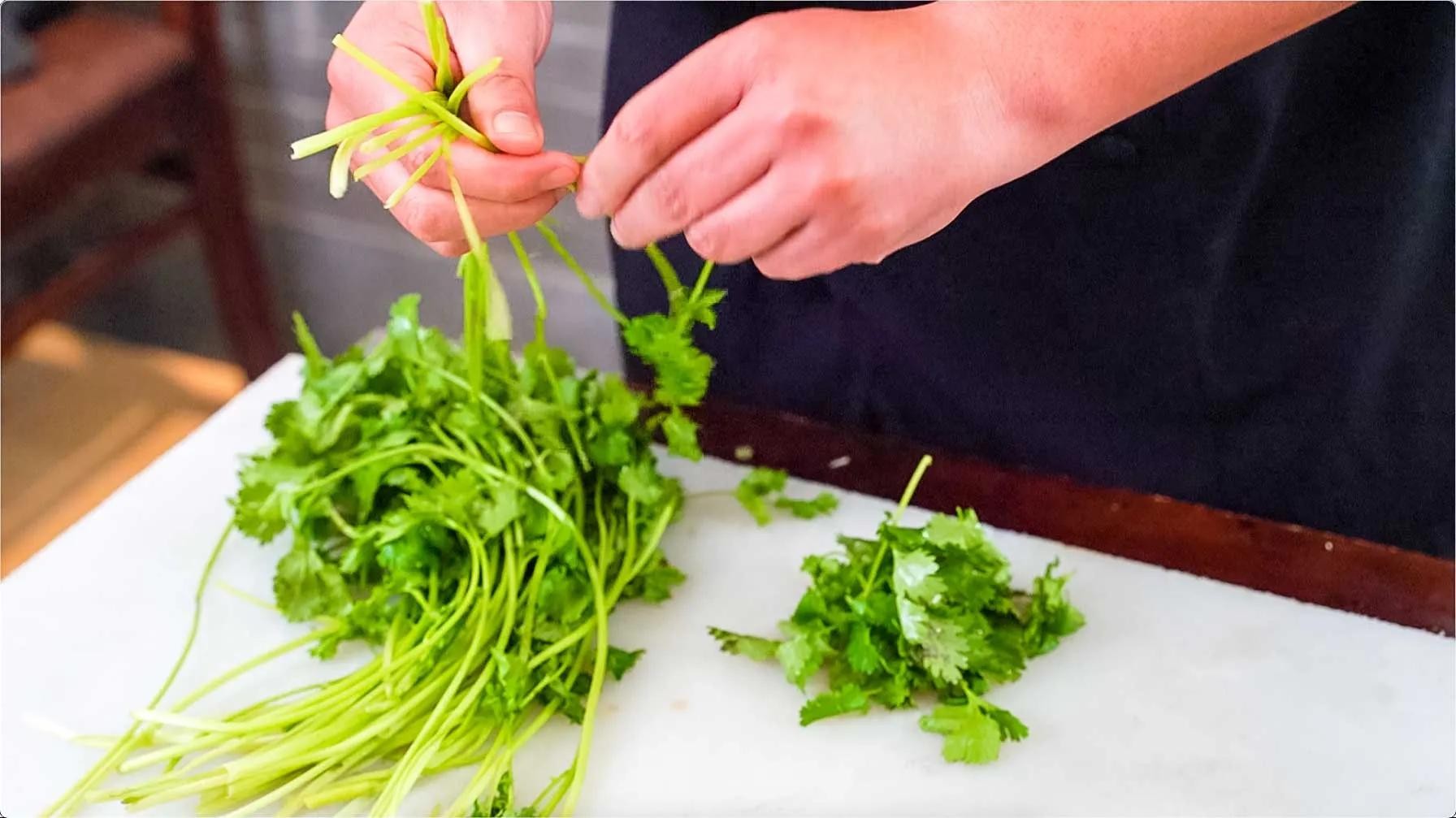 香菜清洗干净然后再切段,主要用到的就是香菜根,这样炒出来的香菜更好吃。