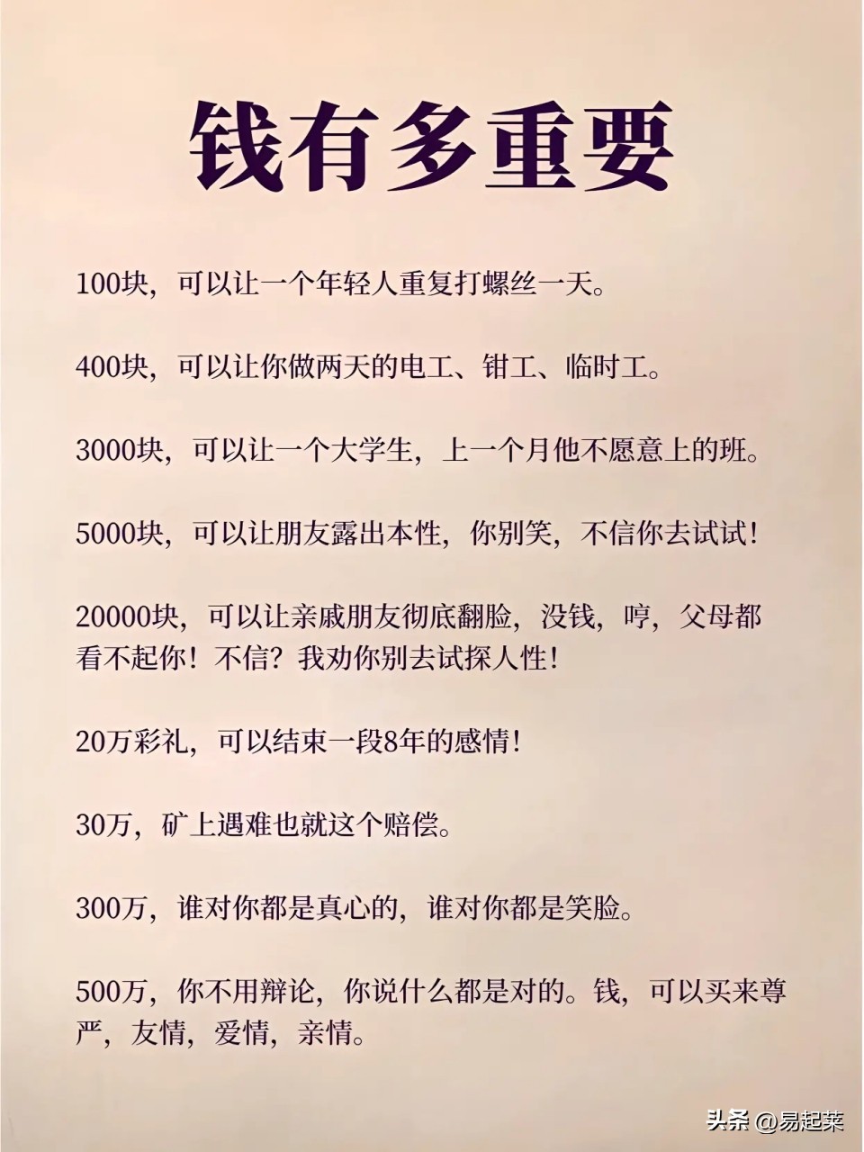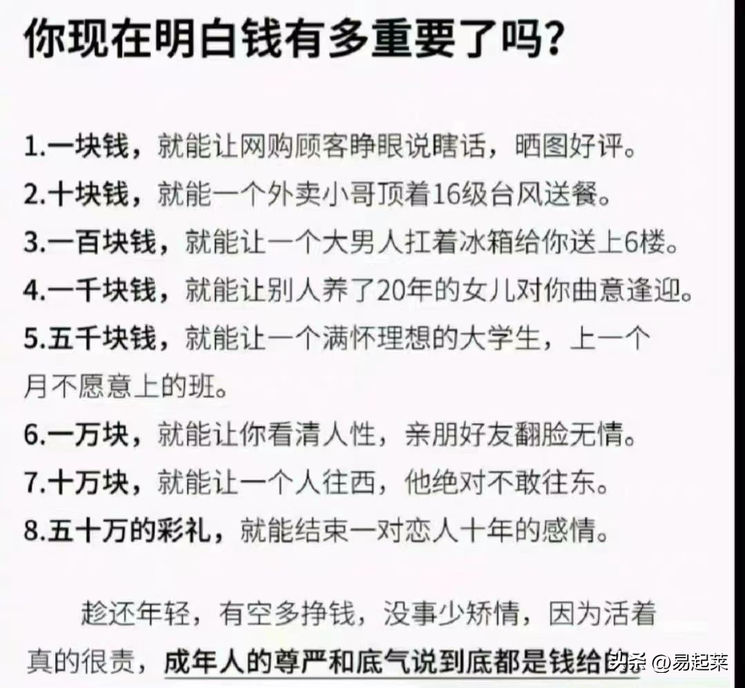 金钱在人生中具有多重重要性。它不仅关乎我们的生活质量、社会地位和个人成就,还能在一定程度上满足我们的心理需求。然而,我们也需要认识到金钱的局限性和正确价值观的重要性。在追求财富的过程中,我们要保持平衡和全面发展,同时承担起应有的社会责任。只有这样,我们才能真正实现金钱与人生的和谐共生。#钱对一个人来说,有多么的重要?##钱的重要性##你是什么时候明白钱的重要性的?#