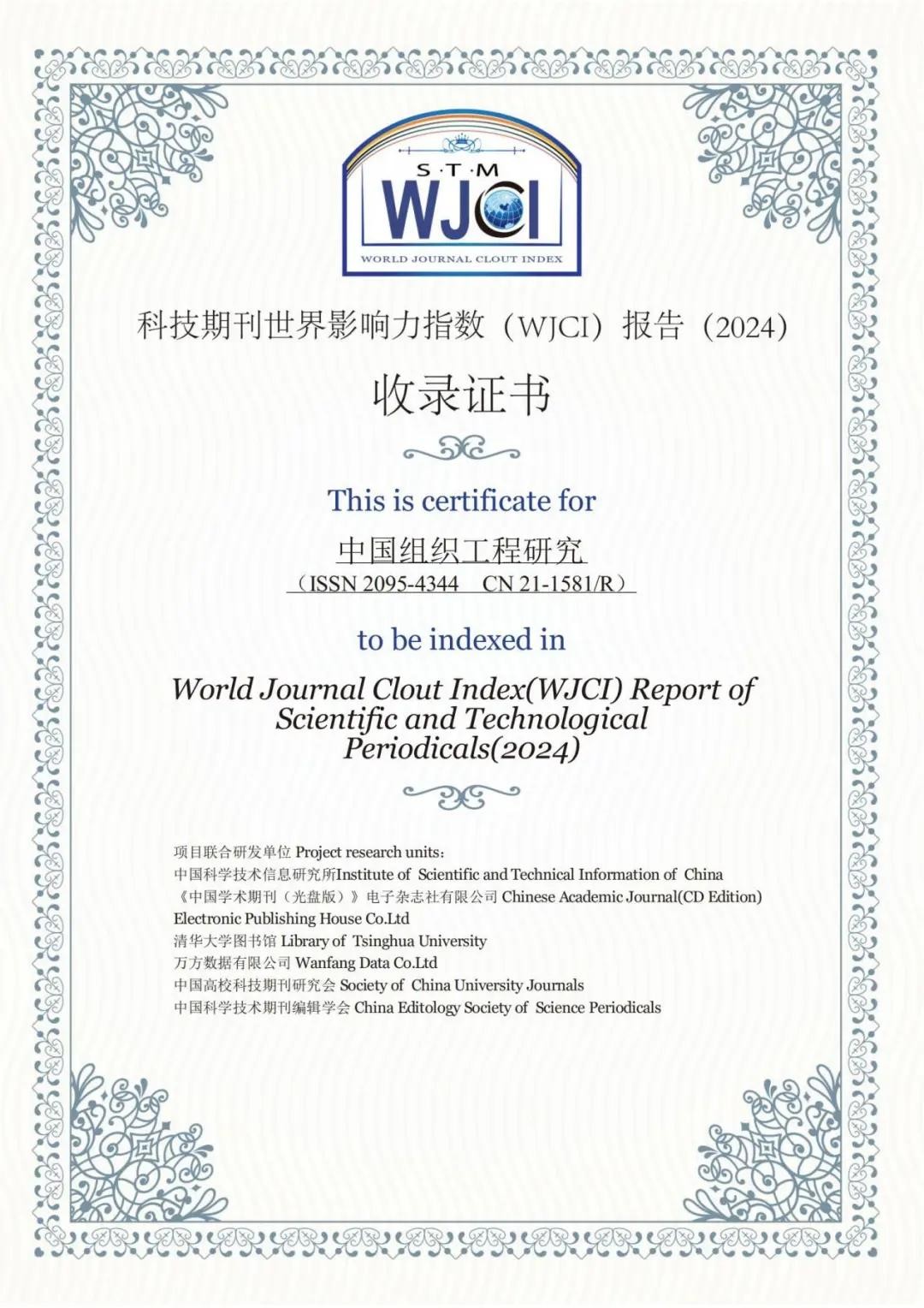 《中国组织工程研究》杂志在2024年度再次被《WJCI报告》收录,连续入选全球康复医学Q2区(位居世界影响力指数第41位),并首次入选全球生物医学工程领域Q3区(位居世界影响力指数第81位)。期刊核心指标稳步上升,其中总被引频次达到4428次,影响因子0.690。