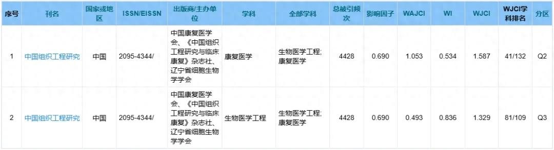 WJCI发布:《中国组织工程研究》杂志入选全球康复医学Q2区,并首次入选全球
