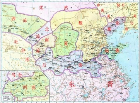 两晋前后延(西晋、东晋和十六国,六国"史称源出于北魏崔鸿所撰的《十六国春秋》:"五凉、四燕、三秦、二赵,并成、夏为十六",从公元304年匈奴贵族刘渊建立汉国,316年灭掉西晋,到439年鲜卑拓跋部统一北方,这100多年里,北方各民族相互争战,先后建立了前赵(匈奴)、后赵(羯)、前燕(鲜卑)、前凉(汉)、前秦(氐)、后秦(羌)、后燕(鲜卑)、西秦(鲜卑)、后凉(氐)、南凉(鲜卑)、西凉(汉)、北凉(卢水胡)、南燕(鲜卑)、北燕(汉)、夏(匈奴)、成汉(巴氐)等政权,总称十六国。)