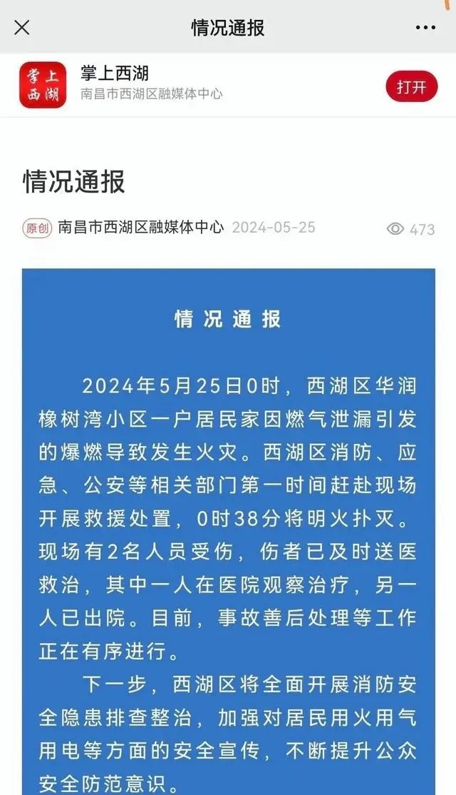 事发当天,“南昌市西湖区融媒体中心”发布了一份《情况通报》,《通报》中称:“2024年5月25日0时,西湖区华润橡树湾小区一户居民家因燃气泄漏引发的爆燃导致发生火灾。西湖区消防、应急、公安等相关部门第一时间赶赴现场开展救援处置,0时38分将明火扑灭现场有2名人员受伤,伤者已及时送医救治,其中一人在医院观察治疗,另一人已出院。目前,事故善后处理等工作正在有序进行。”