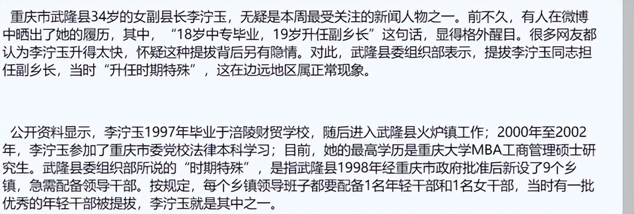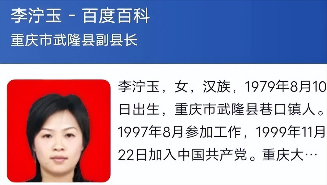 这位女干部1997年还在重庆市涪陵区财贸学校学习,结果到了1998年就已经是武隆县龙坝乡副乡长了,如此快速升迁的经历也让很多人感到惊讶;而且在那几年,不少被挂在互联网上的干部通常都没有什么好结果,可关于李泞玉的调查结果着实打了很多人的脸。