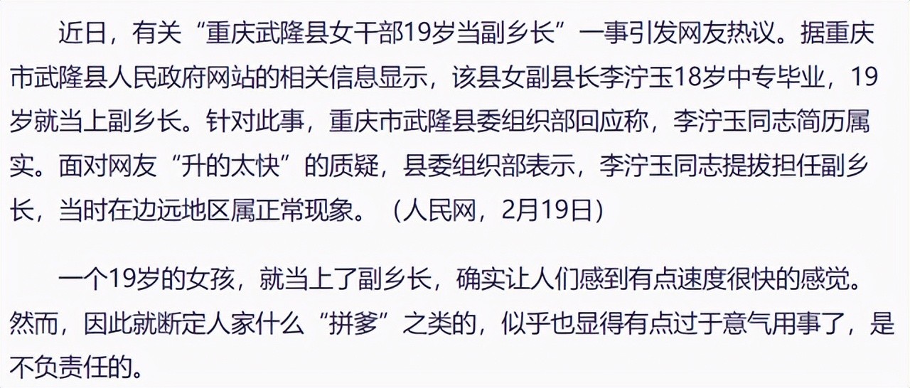 若是仅仅因“19岁当副乡长”就表示绝不相信,那便是真的有些以偏概全了,在官方已经给出解释的情况下还不顾场合地向外界传播,那至少是一种不负责任的做法。
