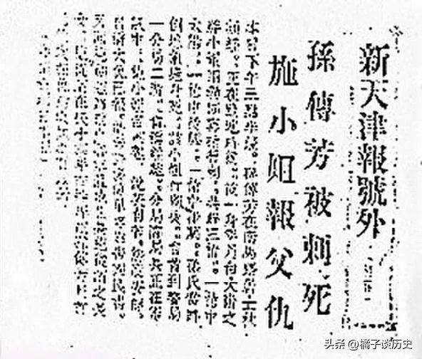 奇案五 佛堂喋血记,事件起因,1926年初,孙传芳命李宝璋在蚌埠车站南侧将施从滨斩首,并暴尸三日,国民党军统局利用施剑翘为父报仇的心态,让其刺杀孙传芳,并为施剑翘提供手枪。1935年11月13日下午3点,施剑翘在天津市的一个佛堂中对孙传芳连击三枪,至此孙传芳毙命于于天津居士林佛堂。施剑翘一弱女子为父报仇的新闻,很快引发了轩然大波。在当时那个封建时代,替父报仇乃是天经地义。因而被视为“侠女”。而蒋介石早已视孙传芳为眼中钉,趁机做了个顺水人情,赦免了施剑翘,仅判处施剑翘一年刑期。