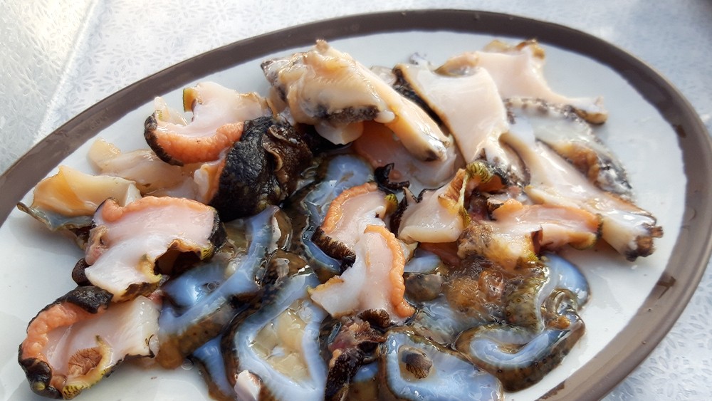 鲍鱼在清洗后会变得很硬,因此活鲍鱼尝起来口感很脆,很有韧劲,即便入了口,它还在展现它的生命力。