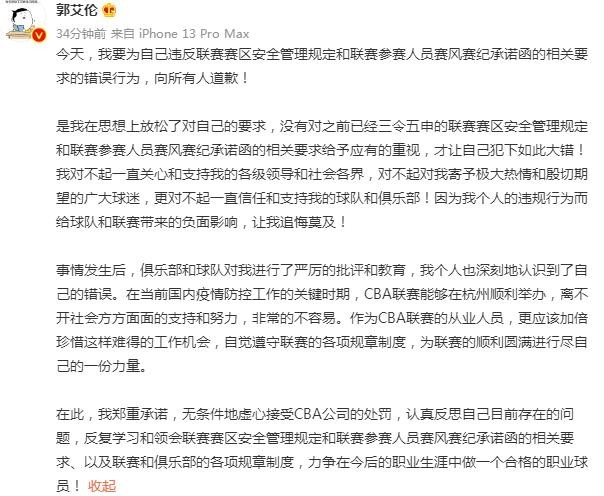 郭艾伦发文道歉:无条件接受CBA公司处罚 深刻反思自身存在的问题