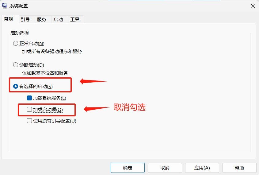 Step5:进入系统配置界面,点选【有选择的启动】,取消加载启动项的勾选;
