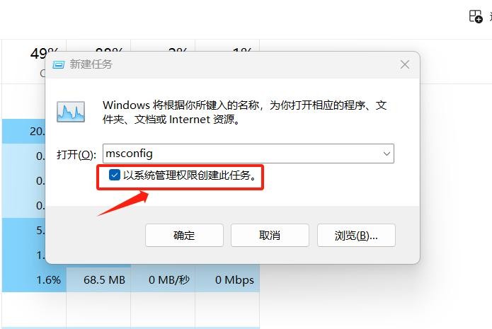 如以上操作无效,可进行下一步尝试。Step1:按住【Ctrl+Alt+Del】调出【任务管理器】,选择左上角【文件】中【运行新任务】,在弹出的窗口中改为输入【mscorfig】,勾选【以系统管理员权限创建此任务】;