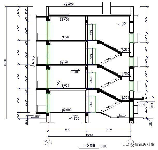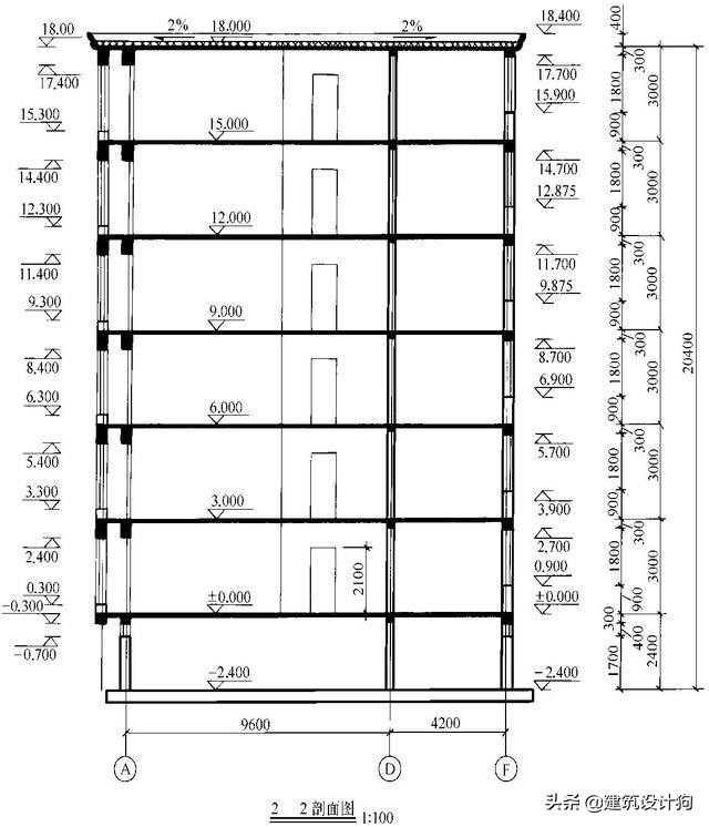 ①最外一道是总高尺寸:它表示室外地坪到楼顶部女儿墙的压顶抹灰完成后的顶面的总高度。