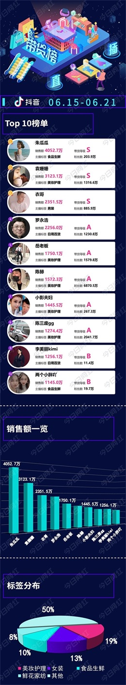 淘宝榜则由薇娅viya以5.51亿夺得榜一,淘宝榜总额为14.34亿元。抖音榜明星“袁姗姗”带货3123万。