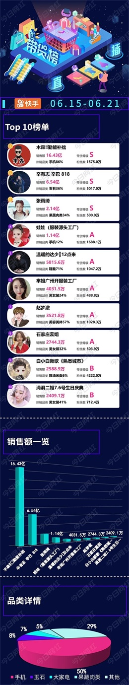 电商带货榜 | 快手木森一周卖货16.43亿元,最热销的产品是它?
