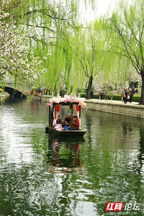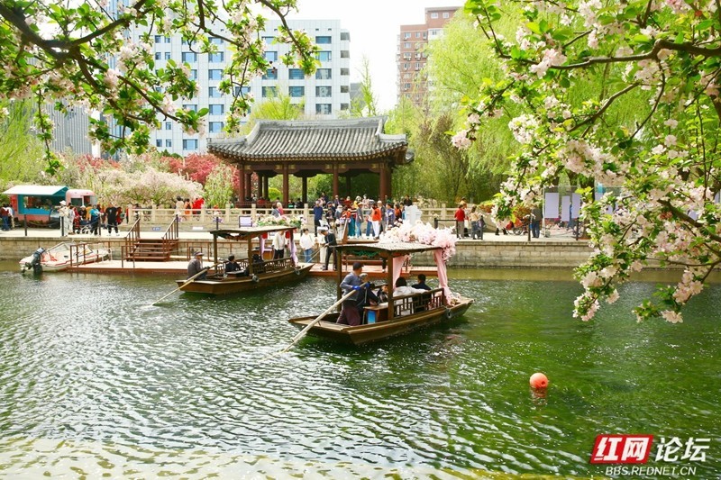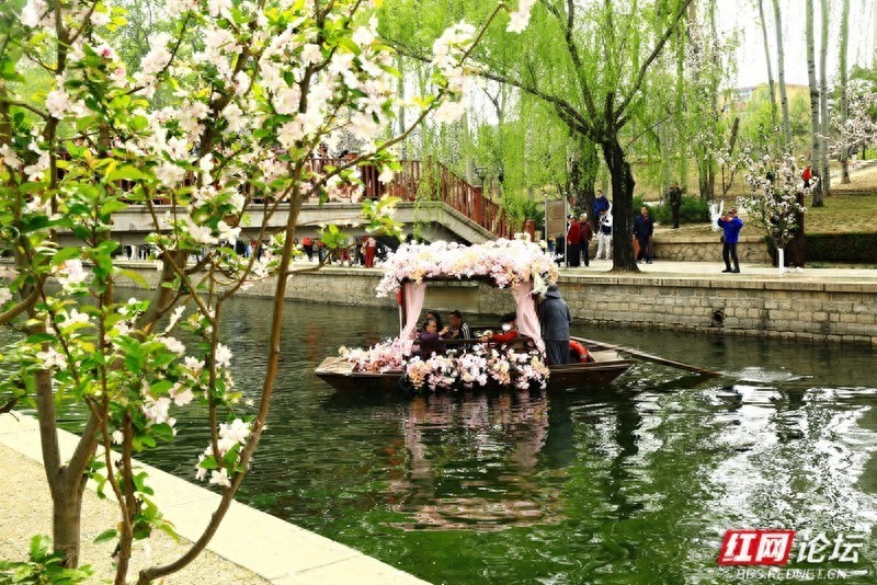 近日,海棠花溪5000余株海棠竞相绽放,赏花的人流如织如梭。与往年相比,今年这里新上了游船项目。扎着花的小船、穿戴整齐的船工,一撸一摇,带着游人在花溪中荡悠,为花溪又添了一景。
