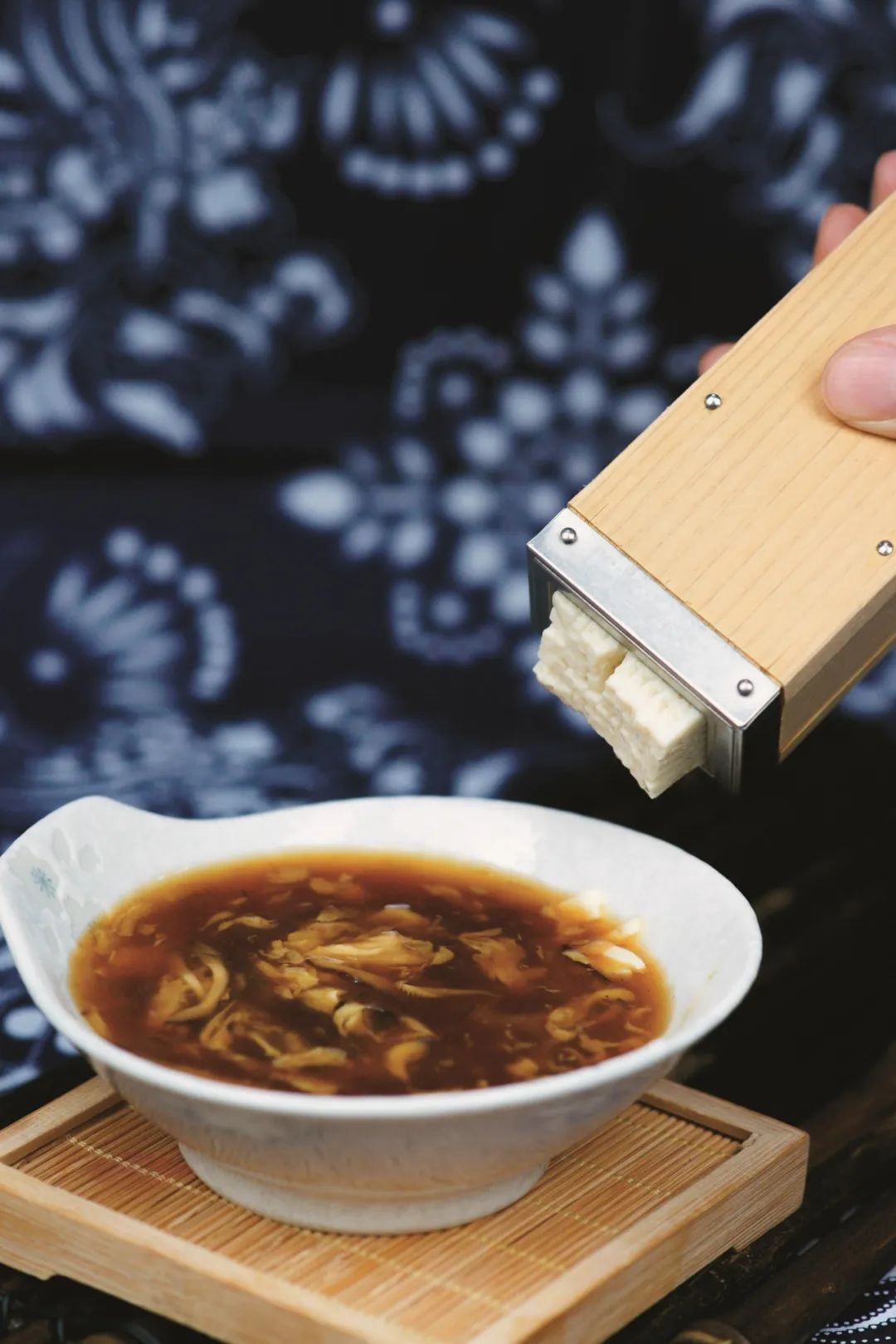 在日本偶然看到的这个木质容器,解决了美林先前对家里酸辣汤不满意的地方,那便是豆腐因入锅时间长而太老。这个大家美其名曰“豆腐枪”的到来,解决了这个难题,把嫩豆腐切块后塞进“豆腐枪”,直接推入热腾腾的酸辣汤碗里,豆腐被自动切成一个个细条,细腻爽滑的豆腐撞上浓郁且滚烫的汤汁,世界上完美的酸辣汤就此诞生。