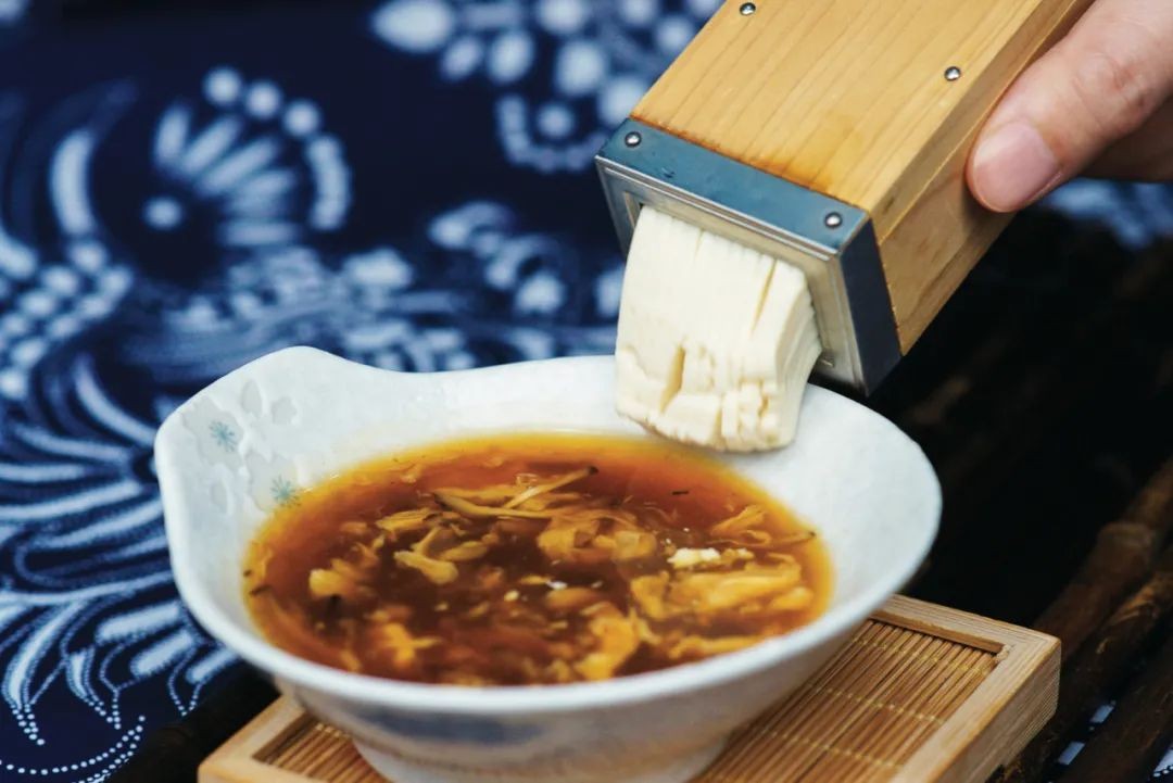 当酸辣汤和“豆腐枪”同时端上饭桌,让客人用豆腐枪直接将豆腐推进酸辣汤里,既满足了客人的好奇又满足了大家的味蕾,并还有一丁点儿成就感。