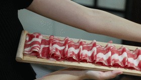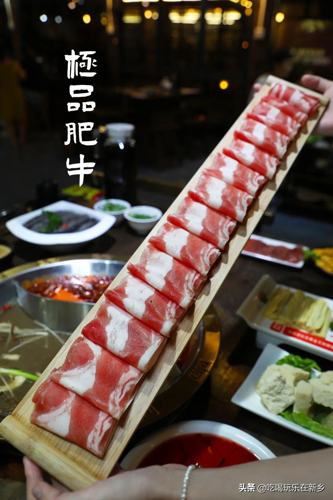 极品肥牛也叫一米肥牛,铺满肉的盘子足有一米长!份量十足,红白相间,纹路清晰