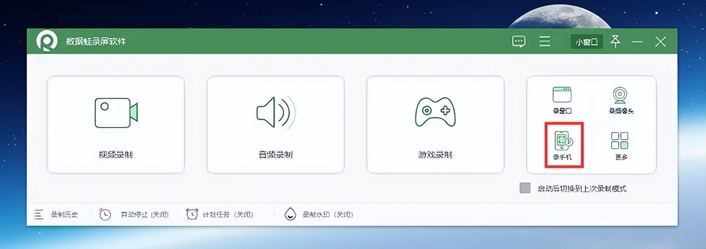 第1步:在电脑上搜索并下载数据蛙录屏软件,安装完毕后,打开该软件,您可以看到多个录屏模式,包括音频录制、摄像头录制、录手机等,我们选择录手机模式。