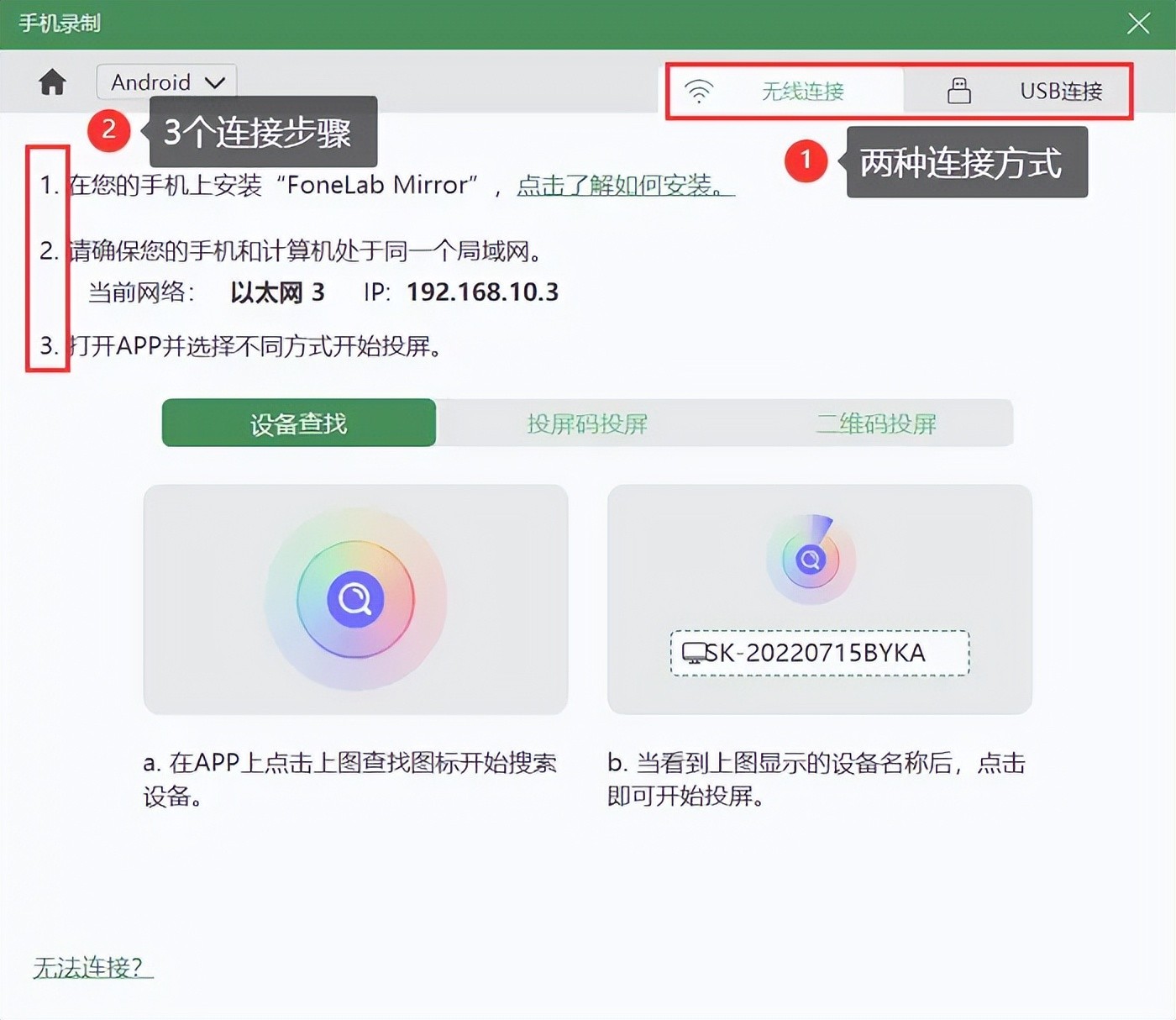 第2步:在“录手机”页面中,根据华为手机类型选择安卓录制,连接方式有无线连接与USB连接两种,通过官方提供的操作步骤将您的华为手机投屏到电脑上。