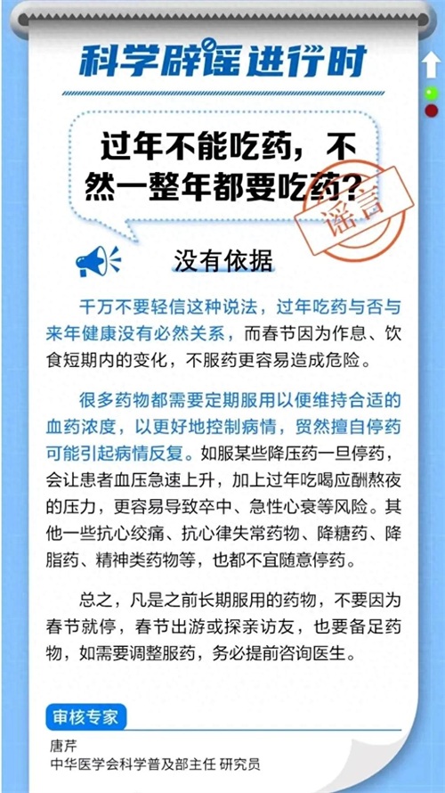 其次,吃药是为了保护和改善健康,减少疾病对我们身体的伤害。如果因为受到谣言的影响而放弃吃药,可能会导致病情恶化,进而给我们的新年带来实实在在的困扰和不快。