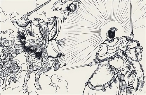 火灵圣母招动三千火龙兵冲杀进周营,势不可当,周营死伤者不计其数。龙吉公主上马拎剑,见洪锦伏鞍而逃,又见火势冲天,正欲念咒救火,一块金光奔至面前,龙吉公主不知所以,被火灵圣母一剑砍伤胸膛。龙吉公主拨马逃走。
