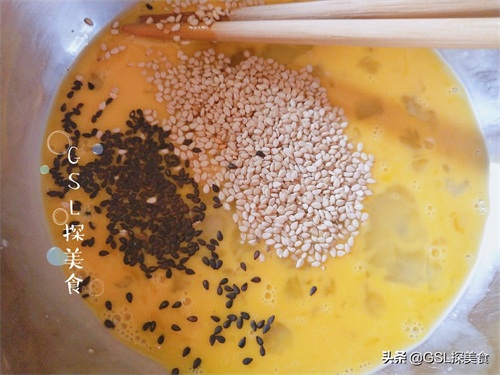 第一步,先准备一个小盆,里面先磕入一个较大的鸡蛋,用筷子先把鸡蛋搅散,然后加入一勺白糖,根据自己口味添加,也可以加入一勺食盐做成甜的,接着把白芝麻和黑芝麻也放进去。