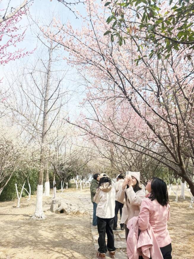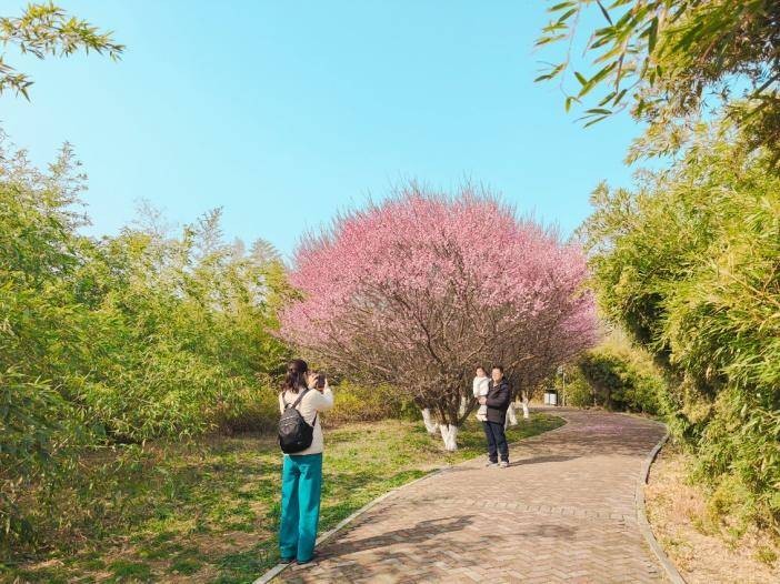 在天门赏梅,植物园也是必去的打卡胜地之一。2月15日,笔者踏入天门植物园,如闯入粉色云霞,千枝万树的梅花开得肆意。粉白花瓣层层舒展,嫩黄花蕊藏于其间,娇艳点点,俏立枝头。当前正值梅花最佳观赏期,花期预计可持续至3月,不少市民前来打卡拍照,沉醉在这如梦似幻的美景中,感受着春的气息。