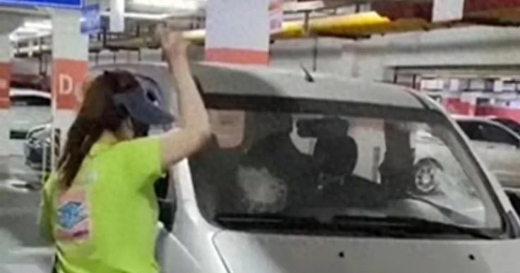 遛狗女子心疼,遂抡砖砸司机挡风玻璃。