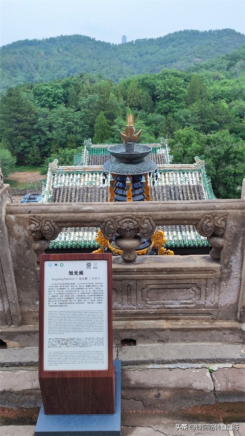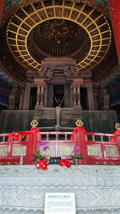 旭光阁,正门面对磬锤峰。阁中须弥座上的"曼陀罗"上有一尊铜制的藏传佛教的"上乐王佛",又称"欢喜佛"。阁内的天花藻井造型工艺,巧夺天工,其精美程度在外八庙中首屈一指。坛城布置一切如旧,尽显陈腐之气,唯有阻挡游客栏杆比较新,四周可绕行游览。